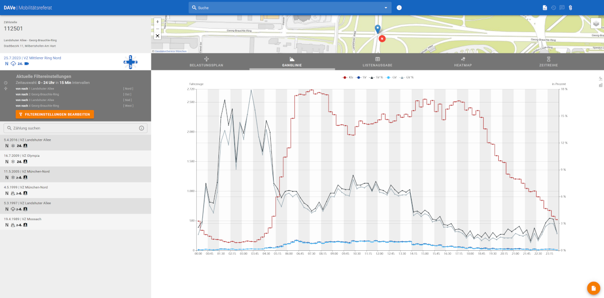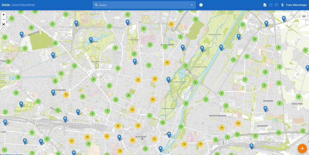 Alle seit 1989 in München durchgeführten Verkehrszählungen können mit der Fachanwendung DAVe eingesehen werden. Für die Auswertung stehen verschiedene Diagramme zur Verfügung, die bei Bedarf auch als PDF-Bericht heruntergeladen werden können. Neue Zählstellen und Verkehrszählungen können angelegt und direkt mit dem Zähldienstleister beauftragt werden. Die erhobenen Daten helfen bei der Analyse der Verkehrsentwicklung und werden unter anderem zur Planung neuer Radwege verwendet. Außerdem bilden sie die Grundlage für die Verkehrsmengenkarte, auf der interessierte Bürger die Verkehrsbelastungen auf Münchens Straßen online einsehen können.